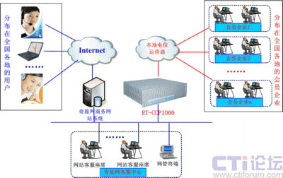 融天科技采用自主研發(fā)的融合通信平臺RT-CCP1000設(shè)備一套為奇旅網(wǎng)部署了一套Web-call聯(lián)絡(luò)中心。RT-CCP1000集傳統(tǒng)PBX、IP-PBX、CTI、IVR、DB、VOIP、錄音、傳真等服務(wù)于一體,以模塊化的形式提供用戶所需的各種功能,是一套功能強(qiáng)大的一體化融合通信平臺,安裝部署非常方便,維護(hù)管理非常簡單。該方案中,與本地電信運(yùn)營商采用數(shù)字中繼E1接口和模擬中繼FXO接口方式連接,軟電話以控件方式嵌入到奇旅網(wǎng)公司的商務(wù)網(wǎng)站上, RT-CCP1000將接收所有以該控件方式來至Internet來的呼叫,并通過與電信運(yùn)營商接口呼叫相關(guān)會員企業(yè)綁定的聯(lián)絡(luò)電話,這樣就實現(xiàn)了上網(wǎng)用戶通過電腦與會員企業(yè)免費(fèi)進(jìn)行直接聯(lián)絡(luò)。網(wǎng)絡(luò)拓?fù)鋱D如下: