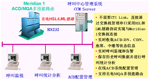 華呼CCM系統(tǒng)不需要Meridian Link,直接通過交換機(jī)管理串口采用HSL(High-Speed Link)和LML(Load Management Link)鏈路協(xié)議實(shí)現(xiàn)與Meridian 1交換機(jī)連接;實(shí)時收集ACD座席、隊(duì)列、中繼等狀態(tài)信息,提供實(shí)時監(jiān)控和告警;保存各類歷史呼叫數(shù)據(jù),提供多種統(tǒng)計(jì)分析手段;提供ACD有關(guān)參數(shù)的實(shí)時和預(yù)定配置管理功能;支持北電MQA(Multiple Queue Assignment)技能路由功能,使座席可同時登錄到5個ACD隊(duì)列,在交換機(jī)內(nèi)部實(shí)現(xiàn)技能路由;對各類數(shù)據(jù)分析以表格、直方圖、餅圖等方式進(jìn)行直觀顯示并可進(jìn)行打印,以及提供多樣的告警提示。