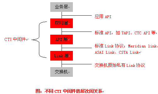 API層產(chǎn)品:實(shí)現(xiàn)把標(biāo)準(zhǔn)Link協(xié)議轉(zhuǎn)化為標(biāo)準(zhǔn)的API,如CTC API、TAPI、JTAPI等,為CTI應(yīng)用開發(fā)提供一套標(biāo)準(zhǔn)的API,屏蔽了不同交換機(jī)擁有的CTI協(xié)議和CTI接口,使應(yīng)用程序員無(wú)需關(guān)心消息是如何在計(jì)算機(jī)和交換機(jī)之間傳遞,專注于客戶端的應(yīng)用開發(fā),實(shí)現(xiàn)應(yīng)用程序與交換機(jī)平臺(tái)無(wú)關(guān)性。