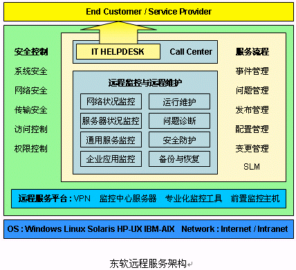 東軟遠(yuǎn)程服務(wù)解決方案涵蓋了Helpdesk服務(wù)、遠(yuǎn)程監(jiān)控與維護(hù)、服務(wù)流程控制、服務(wù)質(zhì)量保證、網(wǎng)絡(luò)與系統(tǒng)安全等多個方面的內(nèi)容,不但在日常的監(jiān)控和遠(yuǎn)程維護(hù)方面采用了高安全性的服務(wù)模式,而且基于ITIL規(guī)范在整體的服務(wù)規(guī)范、服務(wù)質(zhì)量方面形成了自身的服務(wù)標(biāo)準(zhǔn)流程,從而有效地提高了服務(wù)水平和客戶滿意度。