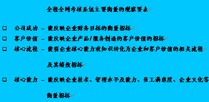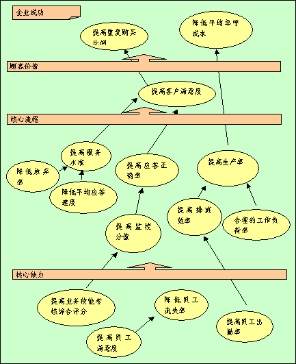 全程全網(wǎng)考核策略目標因果關(guān)系圖是"平衡計分卡"應用的重要環(huán)節(jié),在此要特別強調(diào)?因為它是將根據(jù)公司遠景規(guī)劃以及使命確定的四個考核維度轉(zhuǎn)化為全程全網(wǎng)考核系統(tǒng)進入實際操作階段之關(guān)鍵步驟。在平衡記分卡的設(shè)計過程中,它起著承前啟后的作用,在構(gòu)建呼叫中心全程全網(wǎng)考核系統(tǒng)中全程全網(wǎng)考核策略目標因果關(guān)系圖的突破性銜接功能-以其邏輯性的架構(gòu)來界定和描述實現(xiàn)全面績效考核的策略方案。將公司成功、客戶價值、核心流程和呼叫中心核心能力之間的關(guān)聯(lián)清晰地呈現(xiàn),并將企業(yè)的策略與其績效衡量系統(tǒng)相銜接。