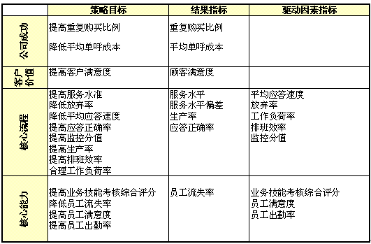 1)公司成功;2)客戶價值;3)核心流程;4)核心能力;成為呼叫中心全程全網(wǎng)考核衡量的四大維度,實際反映了呼叫中心運營管理中成本、客戶、內(nèi)部流程及呼叫中心的學習與成長的四個至關(guān)重要的領(lǐng)域,是實現(xiàn)公司遠景規(guī)劃與使命的營運管理核心。