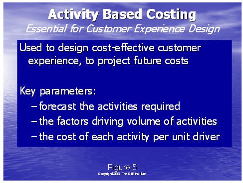 圖7說(shuō)明了管理組眼中的傳統(tǒng)的成本可以怎樣分配到各行動(dòng)和成本對(duì)象上去,以至于最后收入的真實(shí)成本可以在不同的客戶群上得以體現(xiàn)。下面的圖表顯示了以地理劃分的客戶群,但是很可能分配成本對(duì)象到其它的客戶群方案里,如人口統(tǒng)計(jì)學(xué)群體,銷售渠道(零售,互聯(lián)網(wǎng),代理)或其它的設(shè)計(jì)客戶經(jīng)驗(yàn)的有用的種類中。
