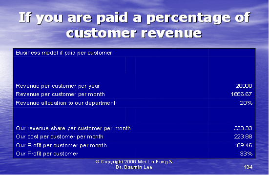 根據(jù)圖表12,我們可以算出第二種方式的利潤百分比。如果我們假設(shè)每個(gè)客戶每年的收入是20,000美元,其中分配給呼叫中心部門的收入是20%。我們每個(gè)客戶每月的收入是333.33美元,每個(gè)客戶月的成本是223.88美元(參見圖表10)。這導(dǎo)致我們來自每個(gè)客戶每月的利潤是109.46美元——這將產(chǎn)生33%的利潤率。