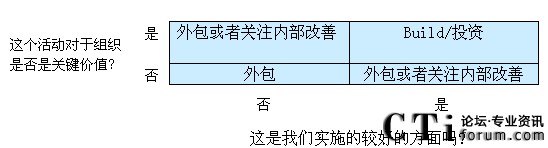 如果這個(gè)活動(dòng)是關(guān)鍵任務(wù),而且有時(shí)候你有穩(wěn)固的內(nèi)部資源和已經(jīng)證明的能力,那么你很可能想保持自建活動(dòng),并內(nèi)部投資其增長(zhǎng)。但是,如果這個(gè)活動(dòng)不是那么重要,或者你現(xiàn)在在做的事并沒有做好,那么外包的意義就更大。