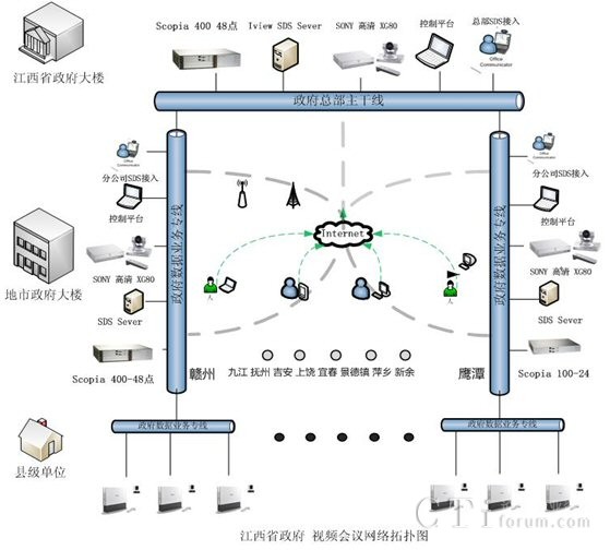 江西省政務(wù)信息網(wǎng)縱向網(wǎng)市縣聯(lián)網(wǎng)工程,在省市聯(lián)網(wǎng)工程的基礎(chǔ)上,把省、設(shè)區(qū)市兩級網(wǎng)絡(luò)延伸到縣(區(qū)),實現(xiàn)省、設(shè)區(qū)市、縣(區(qū))三級聯(lián)網(wǎng)。會議電視系統(tǒng)要實現(xiàn)省、設(shè)區(qū)市、縣(區(qū))三級聯(lián)網(wǎng),省領(lǐng)導(dǎo)通過會議電視系統(tǒng)召開省、設(shè)區(qū)市、縣(區(qū))三級會議,各設(shè)區(qū)市領(lǐng)導(dǎo)也可以通過會議電視系統(tǒng)召開設(shè)區(qū)市、縣(區(qū))兩級會議。并能同時實現(xiàn)多個多點會議電視的召開。整個系統(tǒng)能實時地采集和顯示數(shù)據(jù)、圖像、聲音資料等,供會議電視系統(tǒng)和決策支持系統(tǒng)使用。還具有召開多點研討會、評審會、技術(shù)培訓(xùn)和遠(yuǎn)程教育等功能。視頻會議工程將建設(shè)12個設(shè)區(qū)市會議電視管理中心和112個分會場(全省112個縣、區(qū)),共124個點。