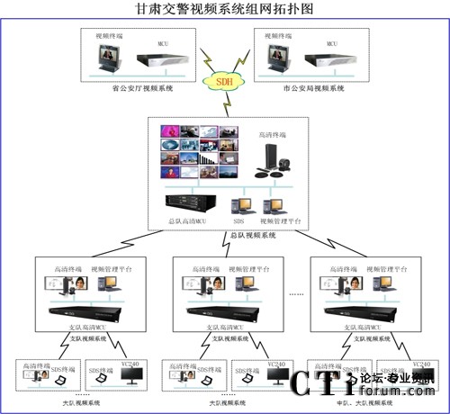 本次建設(shè)的交警總隊(duì)視頻會(huì)議系統(tǒng),包含覆蓋全省交警總隊(duì)、多個(gè)支隊(duì)、大隊(duì)、中隊(duì)的大型視頻會(huì)議網(wǎng)絡(luò)。其中包含了2個(gè)總隊(duì)會(huì)場(chǎng)16個(gè)支隊(duì)、100個(gè)大隊(duì)與16個(gè)中隊(duì)。交警總隊(duì)、支隊(duì)、大(中)隊(duì)與省公安廳、市州公安局通過(guò)SDH專線進(jìn)行交互訪問(wèn),支隊(duì)與市州公安局、大隊(duì)與區(qū)縣公安局、總隊(duì)到各支隊(duì)的網(wǎng)絡(luò)均為專線聯(lián)接。