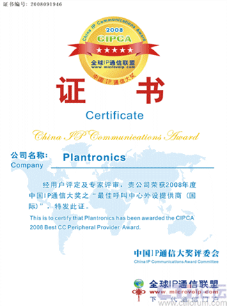 在近日結(jié)束的CIPCA2008年度中國IP通訊大獎(jiǎng)評(píng)選中,繽特力(Plantronics) 榮獲“最佳呼叫中心外設(shè)提供商(國際類)”稱號(hào)。