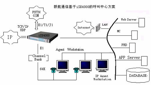 相對于現(xiàn)在的兩種主流呼叫中心方案,毅航通信基于iSX4000呼叫中心解決方案直接整合了Internet的接入。傳統(tǒng)由IVR完成的操作也可以通過Web頁面上的流程實現(xiàn),這樣用戶通過下拉菜單、簡單填寫、點擊按鈕等操作完成客戶識別、業(yè)務(wù)識別等操作,這些流程完成后,通過VoIP對呼叫中心呼入,由呼叫中心對呼入進(jìn)行受理,再按照相應(yīng)的原則分配到座席,座席再作相應(yīng)的應(yīng)答和處理,從而為客戶提供了一個通過Web站點直接進(jìn)入呼叫中心的途徑,把Internet所具有的豐富信息資源和強(qiáng)大的功能賦予呼叫中心,它向客戶提供一個可訪問的Web站點,使得呼叫中心從“撥叫到交談(Dial to Talk)”發(fā)展到“點擊到交談(Click to Talk)”,通過Internet可以提供IP電話語音呼叫、Call Back、IP傳真、IM、E-mail等功能,擴(kuò)展了通信渠道,一方面用戶可以實現(xiàn)免費接入到呼叫中心,另一方面企業(yè)能夠向更多的客戶提供優(yōu)質(zhì)、方便的服務(wù)資源,而且由于這些資源的價格相對傳統(tǒng)通信便宜,使企業(yè)為客戶提供全國、乃至于全球服務(wù)成為可能,提高了企業(yè)客戶服務(wù)水平,增強(qiáng)了企業(yè)競爭力。毅航通信統(tǒng)一呼叫中心解決方案系統(tǒng)結(jié)構(gòu)如圖所示: