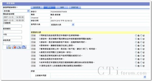 呼叫中心質(zhì)量管理最重要的工作之一,就是評(píng)核各類型業(yè)務(wù)電話服務(wù)的質(zhì)量。為了要做到公平與公正,質(zhì)檢樣本的篩選不只要相同業(yè)務(wù)服務(wù)內(nèi)容,更要相同的 環(huán)境條件,例如:不同業(yè)務(wù)類別(成交電話篩選、抱怨電話篩選)、日期(尖峰日電話篩選、離峰日電話篩選)提供公平的選擇基礎(chǔ)作為評(píng)核的樣本,不因隨機(jī)取樣造成對(duì)客服人員整體績(jī)效評(píng)估失之偏頗。即便呼叫中心因應(yīng)企業(yè)策略產(chǎn)生新的業(yè)務(wù)服務(wù)時(shí),QMS8100KS可充分整合前端應(yīng)用系統(tǒng)的改變,可依據(jù)所需的篩選條件組合或與CTI整合后的篩選字段,完成交叉錄音檔案篩選。