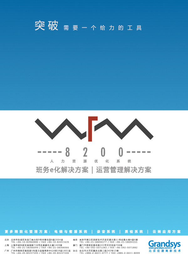 Grandsys 有最堅強(qiáng)的設(shè)計研發(fā)團(tuán)隊,以16年豐富的行業(yè)知識為基礎(chǔ),發(fā)展自有品牌應(yīng)用軟件與專業(yè)服務(wù)事業(yè),盛大推出LOG8000KS錄音與關(guān)鍵詞辨識分析系統(tǒng)、QMS8100KS質(zhì)檢與關(guān)鍵詞辨識分析系統(tǒng)、WFM8200人力資源優(yōu)化管理系統(tǒng)、和eVoice8300電話營銷與客戶服務(wù)系統(tǒng),為企業(yè)打造完整的呼叫中心管理平臺。