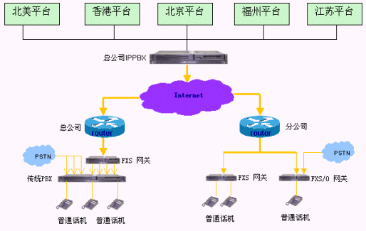 - 建設(shè)企業(yè)內(nèi)部的IP電話系統(tǒng),實(shí)現(xiàn)企業(yè)內(nèi)部各個(gè)分支結(jié)構(gòu)之間的免費(fèi)通話,即總公司之間、各個(gè)分支機(jī)構(gòu)之間、總公司與各個(gè)分支機(jī)構(gòu)之間通訊免費(fèi)。由于各地電話環(huán)境不同,各個(gè)分支機(jī)構(gòu)在使用內(nèi)部通話功能時(shí)候操作有些差異。
