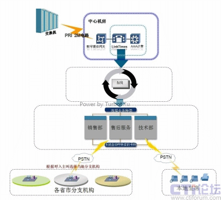 關于IP CallCenter 的應用有很多,最近開始比較流行的一種為托管型呼叫中心系統(tǒng),下面我們共同簡單說明這種應用中的一種方式:無坐席 ,話路通過中心點的IP CallCenter 直接進行呼叫轉移,IP CallCenter 提供ACD等服務,號碼采用400接入方式。