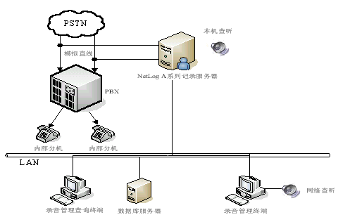 NetLog語音記錄系統(tǒng)采用基于分布式、多層控制管理體系的設計思想,將電話線路與內(nèi)部網(wǎng)絡有效地結合在一起,形成一套完整的語音記錄、管理系統(tǒng)。NetLog系統(tǒng)包括數(shù)據(jù)服務、文件服務、記錄服務、控制臺;