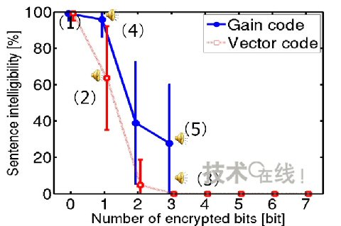 該系統(tǒng)的信息量會(huì)隨bit數(shù)分割的多少大幅度改變。比方說,如果將LD-CELP轉(zhuǎn)換出的10bit數(shù)字音頻數(shù)據(jù)全部分割,在2路徑發(fā)送的情況下,信息量會(huì)增加到4倍的40bit”(NEC)。為了在提高通話保密性的同時(shí),將分散產(chǎn)生的信息量控制到最少,“在音頻數(shù)據(jù)中,只有人類聽覺比較敏銳的部分會(huì)被分割”(NEC)。