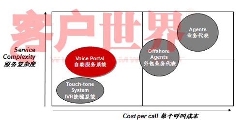讓我們來(lái)看看這張圖。這張圖縱軸是服務(wù)的復(fù)雜度,橫軸是單位呼叫成本,傳統(tǒng)的IVR(觸鍵的語(yǔ)音IVR)和人工服務(wù)相比,服務(wù)的復(fù)雜度可就差多了。而Voice Portal的概念是用比較少的成本做更多的業(yè)務(wù),從成本上講比原來(lái)的傳統(tǒng)的IVR可能成本稍微高一點(diǎn)點(diǎn),但是和人工服務(wù)相比,無(wú)論是和單位自建呼叫中心座席比,還是和外包呼叫中心座席比,成本都有很大降低,但業(yè)務(wù)復(fù)雜度可以做得比傳統(tǒng)IVR復(fù)雜很多。我們承認(rèn),就提供服務(wù)的內(nèi)容來(lái)講,Voice Portal今天仍然不能夠像人工那樣提供那么全面的服務(wù),但是可以涵蓋很多服務(wù)內(nèi)容,在這方面一是因?yàn)榧夹g(shù)先進(jìn)了,另一方面也在于引導(dǎo)。今天我看到越來(lái)越多的客戶已經(jīng)開(kāi)始有意識(shí)的推行自助服務(wù)形式。我前幾年去新加坡打出租,發(fā)現(xiàn)在新加坡有很多叫出租的車站,車站上有一個(gè)按鍵,按鍵上有一個(gè)編碼,說(shuō)明你在什么位置,當(dāng)你打通出租車客服的電話,你只要告訴這個(gè)編碼,他們就自然而然知道你在什么地方,并把要來(lái)接你的車車牌號(hào)通過(guò)語(yǔ)音報(bào)讀方式通知你。今天在中國(guó)也開(kāi)始有這種形式了。昨天我沒(méi)有開(kāi)車,也算是支持北京市每周少開(kāi)一天車的號(hào)召,我打了出租,在和出租司機(jī)聊天的過(guò)程中,出租司機(jī)說(shuō)現(xiàn)在油價(jià)很貴,他們有很強(qiáng)烈的需求不愿意掃馬路,他們也有一個(gè)出租車叫車電話,那個(gè)呼叫中心大概有上百個(gè)坐席,這個(gè)公司有一萬(wàn)六千輛出租車在北京,由他們來(lái)進(jìn)行搶答,搶答完之后你可以告訴說(shuō)這個(gè)人在什么地方等,唯一不同的我們?cè)谧灾线沒(méi)有做得那么到位,司機(jī)搶到了活還要給客戶打一個(gè)電話,不象新加坡完全是自助的,你只要按了那個(gè)鍵,系統(tǒng)就知道你在什么地方,當(dāng)尋找到合適的車的時(shí)候,語(yǔ)音報(bào)讀你車牌號(hào)就行了。我和說(shuō)出租車師傅,那你打電話成本不是增加了嗎,他一笑,增加打一個(gè)電話的成本怎么也比掃馬路強(qiáng)。大家可以看看呼叫中心多有用,自助服務(wù)能省多少錢(qián)。