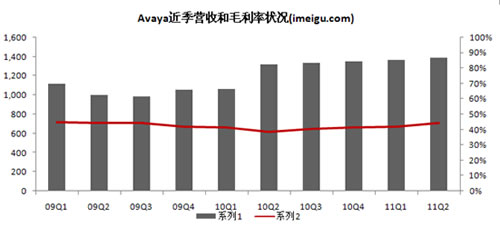 Avaya公司總體上毛利率穩(wěn)定在40%至50%之間,毛利定義為扣除相關(guān)產(chǎn)品成本和服務(wù)成本后的營業(yè)收入。2010財年公司的全球通信解決方案、數(shù)據(jù)網(wǎng)絡(luò)、Avaya全球服務(wù)等業(yè)務(wù)部門的營收分別占總營收的46%、5%、49%,毛利率分別為54%、41%、45%。