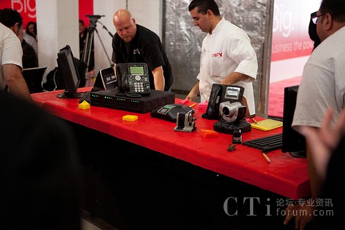 這個(gè)多層蛋糕在Avaya五月舉行的中小企業(yè)“大思維”市場(chǎng)活動(dòng)中登場(chǎng)亮相,它在一張可食用的長會(huì)議桌上逼真呈現(xiàn)了工作中的Avaya電話、視頻會(huì)議解決方案和一套IP Office控制單元。 造型巧克力、谷類食品、軟糖及其它烘焙材料同各種必要的Avaya通信組件結(jié)合在一起制作出的這個(gè)蛋糕被Buddy命名為“科技蛋糕”。 在完成由巧克力仿制電話所撥打的語音通話、并成功支持Buddy和Avaya高級(jí)副總裁兼全球通信解決方案總裁Alan Baratz博士之間的實(shí)時(shí)視頻會(huì)議之后,這個(gè)蛋糕作為甜點(diǎn)供全體活動(dòng)參加者享用。
