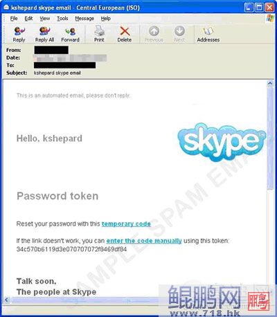 訊息中的連結(jié)雖然已經(jīng)關閉了,但一如預料地并不會進入到合法的Skype網(wǎng)頁。