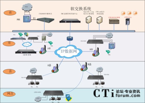 - 地州市分集團(tuán)放置的二級軟交換系統(tǒng),作為其管轄的縣(市)級分集團(tuán)和營業(yè)廳的呼叫控制中心,管理和控制其管轄地區(qū)的IP電話終端設(shè)備。