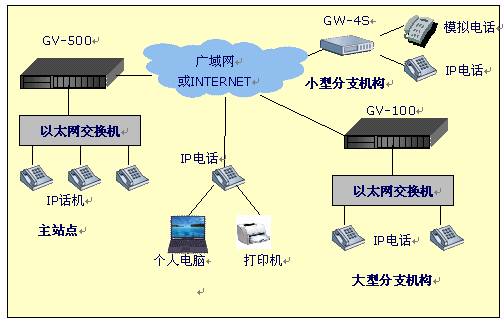 - 分公司:選用一臺4口網(wǎng)關(guān)設(shè)備,接入到互聯(lián)網(wǎng)絡(luò),通過公共的IP交換中心建立起呼叫連接,實(shí)現(xiàn)打電話的功能。模擬了通過網(wǎng)關(guān)設(shè)備接入PBX(電話程控交換機(jī)),如果其它分部也要接入PBX,與此情況類似。(詳見后面的"撥號示例")