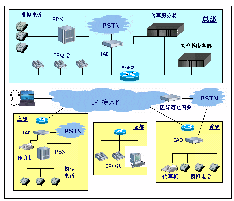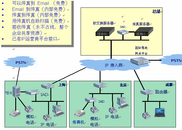 - 內(nèi)部IP電話、傳真網(wǎng)連接各地區(qū)PSTN市話網(wǎng),實(shí)現(xiàn)各地區(qū)間"長途電話變市話"
