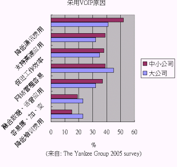 根據(jù)美國(guó)著名的咨詢(xún)公司 The Yankee Group 2005 年的調(diào)研各企業(yè)使用VOIP的原因,大企業(yè)與中小企業(yè)略有差異:大企業(yè)認(rèn)為網(wǎng)絡(luò)管理、省錢(qián)、促進(jìn)工作效率為最關(guān)鍵的三個(gè)原因;中小企業(yè)則認(rèn)為省錢(qián)、網(wǎng)絡(luò)管理容易、支持高速應(yīng)用、促進(jìn)工作效率為主要原因。