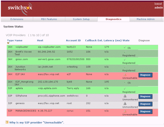 圖5中綠色表示正常,紅色表示出現(xiàn)問(wèn)題,白色表示從沒(méi)有接通過(guò)。如果你按診斷(Diagnose),系統(tǒng)便會(huì)通過(guò)自動(dòng)測(cè)試,告訴你問(wèn)題出自哪一部分。如果需要對(duì)每一個(gè)的詳細(xì)解析,可以按底部Why這個(gè)標(biāo)題,找尋答案。類(lèi)似的終端、話(huà)機(jī)等配置、硬件診斷等,也有非常明了的界面與解決問(wèn)題的辦法。