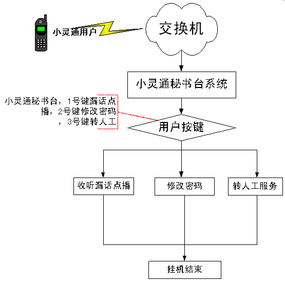 當(dāng)主叫用戶撥打被叫小靈通用戶,而被叫小靈通用戶處于不可達(dá)(關(guān)機(jī)、忙、不在服務(wù)區(qū))狀態(tài)時(shí),該呼叫自動(dòng)轉(zhuǎn)入轉(zhuǎn)到小靈通秘書臺(tái)系統(tǒng)后,用戶選擇2號(hào)鍵,系統(tǒng)會(huì)將此來話轉(zhuǎn)入人工臺(tái),由人工秘書為此主叫服務(wù)。