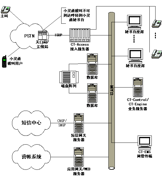 如上圖所示,小靈通秘書臺(tái)網(wǎng)絡(luò)拓?fù)鋱D,上圖中紅色虛線的左邊為運(yùn)營商部分,紅線是接口部分, 紅色虛線的右邊是增加的小靈通秘書臺(tái)設(shè)備和工程實(shí)施部分。首先需要在小靈通網(wǎng)絡(luò)的關(guān)口局或者匯接局設(shè)置被叫不可到達(dá)(關(guān)機(jī)、忙、不在服務(wù)區(qū))呼叫前轉(zhuǎn),通過ISUP協(xié)議呼叫到小靈通秘書臺(tái)的CT-Access接入服務(wù)器,提取主叫號(hào)碼、被叫號(hào)碼、原被叫號(hào)碼,同時(shí)給主叫播放語音,"您撥的用戶無法接通,您可以選擇失話復(fù)得業(yè)務(wù),本業(yè)務(wù)每條短信收費(fèi)0.1元,漏話提示請(qǐng)按1號(hào)鍵,短信回叫請(qǐng)按2號(hào)鍵,轉(zhuǎn)人工請(qǐng)按9號(hào)鍵"。然后根據(jù)主叫的響應(yīng)選擇提供服務(wù)(業(yè)務(wù)流程見第3章)。小靈通秘書臺(tái)的業(yè)務(wù)部分由CT-Control/CT-Engine業(yè)務(wù)服務(wù)器和數(shù)據(jù)庫服務(wù)器組成,另外包括人工臺(tái)和短信網(wǎng)關(guān),短信網(wǎng)關(guān)通過CNGP(網(wǎng)通)、SMGP(電信)和短信中心網(wǎng)關(guān)接口,實(shí)現(xiàn)短信發(fā)送功能。業(yè)務(wù)網(wǎng)關(guān)和WEB服務(wù)器為可選部分,根據(jù)業(yè)務(wù)需要選配。