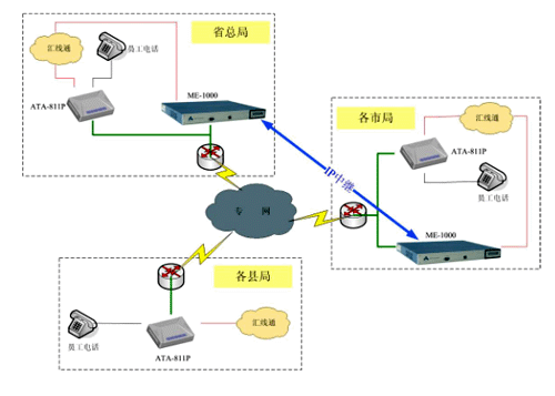 由于用戶數(shù)量較大,我們建議采取分級(jí)管理方式,利用我們Anta科技(北京)有限公司Simplicity 系列IP-PBX產(chǎn)品的靈活性,在每個(gè)市局放置一臺(tái)ME-1000型號(hào)的IP-PBX,管理市局及下屬縣區(qū)局的電話系統(tǒng);省總局放置一臺(tái)ME-1000,管理總局電話系統(tǒng);同時(shí)各市局的ME-1000向總局注冊(cè),形成IP中繼連接,組成全省互通的IP電話管理系統(tǒng)。在終端方面,我們建議采用單端口的ATA-811P桌面型語音網(wǎng)關(guān)連接話機(jī),該網(wǎng)關(guān)通過向IP-PBX注冊(cè),將所有模擬話機(jī)連接到VOIP系統(tǒng)中來。