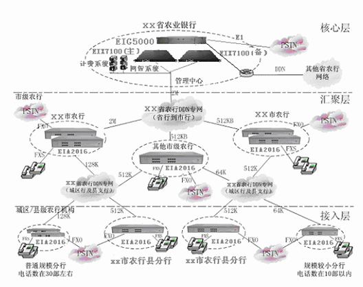 省行、各地市行與縣支行、分理處與數(shù)據(jù)業(yè)務(wù)共用專網(wǎng)線路,實(shí)現(xiàn)VOIP互連,形成一個(gè)全省范圍內(nèi)的VOIP大網(wǎng),實(shí)現(xiàn)全省內(nèi)部語音的免費(fèi)通信和內(nèi)部號(hào)碼的縮位拔號(hào),節(jié)省了各行間的市話費(fèi)用,節(jié)省大量長途話費(fèi)。各節(jié)點(diǎn)按FXO:FXS 1:4申請(qǐng)模擬中繼,由FXO中繼接入入當(dāng)?shù)氐腜STN網(wǎng),撥打本地市話。