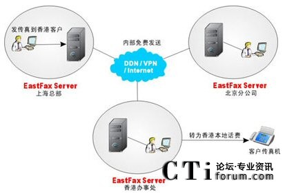 在上圖中,某集團(tuán)公司總部位于上海,在北京、香港有分支機(jī)構(gòu),與分支機(jī)構(gòu)及客戶(hù)之間經(jīng)常有大量的傳真往來(lái)。目前三個(gè)地方已通過(guò)VPN實(shí)現(xiàn)了網(wǎng)絡(luò)互通,且均安裝了EastFax傳真服務(wù)器。