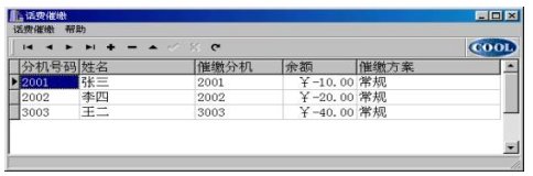 催繳調(diào)度表中的%欠費(fèi)%,用戶(hù)可以從計(jì)費(fèi)系統(tǒng)的月報(bào)表中提出(用戶(hù)輸入月份,自動(dòng)根據(jù)催繳電話(huà)取過(guò)來(lái));也可由用戶(hù)再次修改(針對(duì)所欠不是一個(gè)月的費(fèi)用),但“刷新”又從從計(jì)費(fèi)系統(tǒng)的月報(bào)表中更新數(shù)據(jù)。