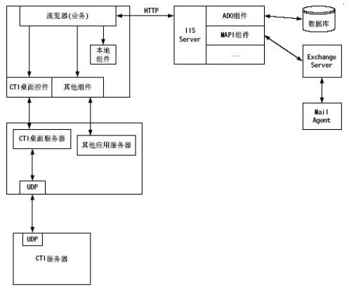 對于所有的電力業(yè)務模塊都是在IE瀏覽器上實現(xiàn),瀏覽器上的應用模塊對WEB Server發(fā)出請求,WEB Server解釋運行ASP程序,利用ASP創(chuàng)建數(shù)據(jù)庫組件訪問系統(tǒng)的數(shù)據(jù)庫信息;利用嵌入WEB頁面的CTI桌面控件可以實現(xiàn)CTI集成功能,如:建立呼叫、應答呼叫、席間轉(zhuǎn)移、人工自動切換等等;利用其他嵌入WEB網(wǎng)頁的組件實現(xiàn)其他擴展功能,如:Exchange