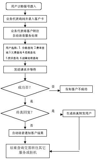 系統(tǒng)自動報受理人員工號,人工交互式受理方式。受理人員根據(jù)用戶要求從服務質(zhì)量標準數(shù)據(jù)庫、電費數(shù)據(jù)庫和其他相連的數(shù)據(jù)庫查詢資料,然后通過語音方式播報資料或送到用戶指定的傳真機或其他終端設備上。主要內(nèi)容如下: