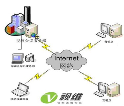 視維團隊根據(jù)海南金海紙漿的網(wǎng)絡(luò)現(xiàn)狀和IT硬件資源以及低碳環(huán)保高效溝通的需求設(shè)計了一套經(jīng)濟可行的視頻會議系統(tǒng)解決方案,以海南金海紙漿為主會場,全國各營銷點為分會場。拓撲圖如下: