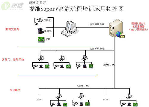 順德安監(jiān)局各部門及下屬單位使用安監(jiān)系統(tǒng)專網(wǎng)進(jìn)行連接,而重點(diǎn)培育企業(yè)網(wǎng)絡(luò)情況復(fù)雜,涉及ADSL以及3G無(wú)線網(wǎng)絡(luò)等多種情況,視維根據(jù)順德安監(jiān)局、局下屬單位及重點(diǎn)培育企業(yè)的分布情況,將服務(wù)器架設(shè)在順德安監(jiān)局總部,并在總部搭建會(huì)議室和培訓(xùn)中心,其他各部門、下屬單位和重點(diǎn)培育企業(yè)為分會(huì)場(chǎng)。