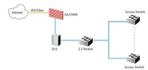 辦公專用網(wǎng)通過一條4M光纖線路連入CNC網(wǎng)絡,在酒店內(nèi)部安裝了ASA5000和ISA等安全管理設備,ISA承擔了NAT等功能;辦公網(wǎng)的信息點數(shù)量大概在200個左右。
