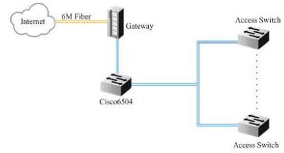 客房局域網(wǎng)通過一條6M的光纖接入CNC網(wǎng)絡,網(wǎng)關設備承擔了DHCP、NAT和流量限制等功能,同時在思科6504上安裝有安全板卡,對內(nèi)部網(wǎng)絡安全進行加強和防御。由于每個客房有2~3個信息點,客房局域網(wǎng)總共有1300個左右的信息點。