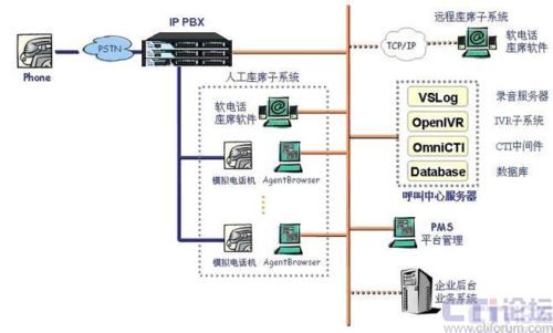 本方案采用IP-PBX 硬件平臺配合CTI系統(tǒng)軟件來建設(shè)呼叫服務(wù)系統(tǒng)。IP-PBX作為坐席接入的硬件接口平臺,采用上海傲威科技有限公司自主研發(fā)的IP-PBX產(chǎn)品AVX2000pro來實現(xiàn),AVX2000pro提供標(biāo)準(zhǔn)RJ11固件接口,為坐席員提供語音接入,坐席員耳麥話機(jī)直接與RJ11接口互連。坐席電腦通過局域網(wǎng)口與CTI軟件服務(wù)系統(tǒng)互連。