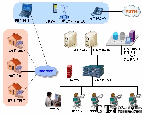 隨著國(guó)內(nèi)城市化地不斷加快,人口老齡化的加劇,人民群眾對(duì)家政服務(wù)需求也越來(lái)越旺盛,家政服務(wù)業(yè)的重要性也日益凸顯。為了規(guī)范家政服務(wù)市場(chǎng)、整合家政市場(chǎng)資源、培育家政服務(wù)示范性企業(yè),國(guó)家商務(wù)部、財(cái)務(wù)部于2009年4月下發(fā)了《關(guān)于推進(jìn)家政服務(wù)網(wǎng)絡(luò)體系建設(shè)的通知》的149號(hào)文件,啟動(dòng)了家政服務(wù)網(wǎng)絡(luò)中心體系建設(shè)的項(xiàng)目,并提出了具體的規(guī)范和要求。以此為起點(diǎn),為更好地服務(wù)社會(huì)滿足人民群眾日益增長(zhǎng)的生活需求而努力。自文件下發(fā)以來(lái),我公司就組織專門(mén)的項(xiàng)目組,對(duì)家政服務(wù)行業(yè)具體業(yè)務(wù)需求的調(diào)研以及開(kāi)發(fā)工作。公司利用多年的開(kāi)發(fā)經(jīng)驗(yàn),經(jīng)過(guò)幾個(gè)月的努力,終于在8月份完成了暢信達(dá)家政服務(wù)網(wǎng)絡(luò)中心的全套建設(shè)方案。與其它系統(tǒng)固化的功能設(shè)計(jì)不同,該方案可以靈活地定制業(yè)務(wù)模塊,方便各地的家政公司根據(jù)本市的情況和需求,確定適合自身的業(yè)務(wù)流程。系統(tǒng)業(yè)務(wù)模塊完整地覆蓋了家政服務(wù)的業(yè)務(wù)范圍與重點(diǎn)。并將家政服務(wù)的業(yè)務(wù)分為營(yíng)業(yè)系統(tǒng)、賬務(wù)系統(tǒng)、后臺(tái)系統(tǒng)等部分,貫穿了市民從訴求提交、工單派發(fā)、工單處理、財(cái)務(wù)結(jié)算到回訪反饋的各個(gè)方面。系統(tǒng)還提供了完善的報(bào)表模塊準(zhǔn)確反映業(yè)務(wù)和系統(tǒng)運(yùn)營(yíng)狀況,有力地支持對(duì)平臺(tái)進(jìn)行運(yùn)營(yíng)管理工作。另外在方案設(shè)計(jì)上,除了滿足業(yè)務(wù)處理需要外,還充分考慮到系統(tǒng)的適應(yīng)性、穩(wěn)定性和處理的能力。首先為了滿足各地市對(duì)家政平臺(tái)的不同需求,公司專門(mén)推出了基于IBM服務(wù)器的和暢信達(dá)標(biāo)配服務(wù)器的兩種建設(shè)方案。暢信達(dá)標(biāo)配服務(wù)器方案可提供最低4模擬外線最多1條數(shù)字中繼(E1)接入,適用于初期規(guī)模較小且投資規(guī)模不大的客戶。而基于IBM服務(wù)器的方案,則主要是滿足業(yè)務(wù)量較大,同時(shí)對(duì)設(shè)備配置要求高的城市,以數(shù)字線接入為主。多種建設(shè)模式充分體現(xiàn)了方案的靈活性、可擴(kuò)展性的特征,有效地減少了運(yùn)營(yíng)風(fēng)險(xiǎn),提升了個(gè)性化定制化服務(wù)的水平。其次,根據(jù)家政市場(chǎng)需求預(yù)測(cè)以及已開(kāi)通家政服務(wù)網(wǎng)絡(luò)中心城市的實(shí)際運(yùn)營(yíng)情況,一個(gè)中型城市,預(yù)計(jì)電話開(kāi)通之后,話務(wù)量平均每天近3000個(gè),這就要求系統(tǒng)不但有穩(wěn)定的性能而且要有強(qiáng)大的處理能力。我公司從系統(tǒng)平臺(tái)構(gòu)建、業(yè)務(wù)流程設(shè)計(jì)、設(shè)備性能、組網(wǎng)設(shè)計(jì)等方面著手,為系統(tǒng)提供了足以確保安全穩(wěn)定運(yùn)行的支持。