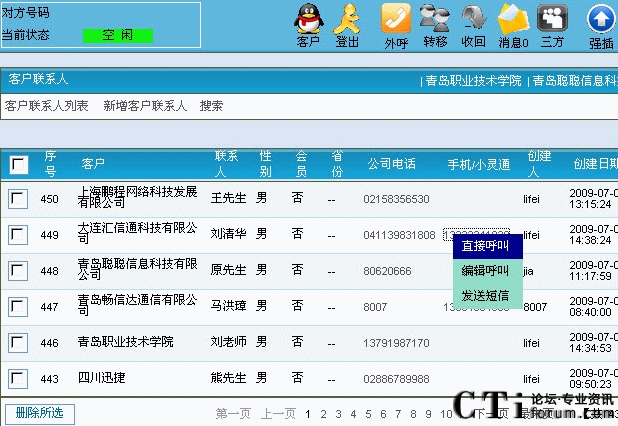 9. 外呼功能:座席人員可以選擇并點(diǎn)擊已有的聯(lián)系人、客戶(hù)的電話號(hào)碼,系統(tǒng)便自動(dòng)外呼并接通座席電話,座席人員也可以手工輸入對(duì)方號(hào)碼,點(diǎn)擊外呼。