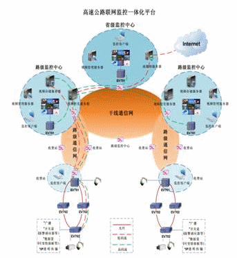 采用H.264編碼標(biāo)準(zhǔn)的EV702外場綜合接入設(shè)備,將原來外場分散的攝像頭、快球、云臺、可變情報(bào)板、報(bào)警感應(yīng)器等設(shè)備融為一體,同時(shí)也支持MPEG編碼標(biāo)準(zhǔn)的視音頻接入。EV702配備光纖通信板卡,不需要光端機(jī),可以直接連接光纖,進(jìn)行遠(yuǎn)距離。通過EV702連接成環(huán),并且具有自愈功能?蛇M(jìn)行集中式(路級監(jiān)控中心)、分布式(各級監(jiān)控中心)存儲。路級中心、區(qū)域中心、省級中心分布式多級監(jiān)控,由省中心統(tǒng)一設(shè)定權(quán)限,進(jìn)行集中管理。