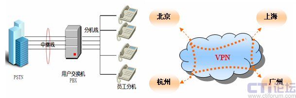 企業(yè)的傳統(tǒng)通信應(yīng)用,在語音電話方面,主要是透過傳統(tǒng)PSTN,通過中繼線連接企業(yè)交換機(jī)。數(shù)據(jù)應(yīng)用方面,分布在全國(guó)各個(gè)省市、自治區(qū)的分支機(jī)構(gòu)主要通過Internet,以E-mail方式聯(lián)絡(luò)。