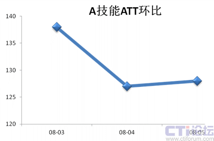 我們選擇話術簡單的“A技能”來分析,分別取3~5月的A技能ATT統(tǒng)計數(shù)據(jù)進行環(huán)比(如下圖2):