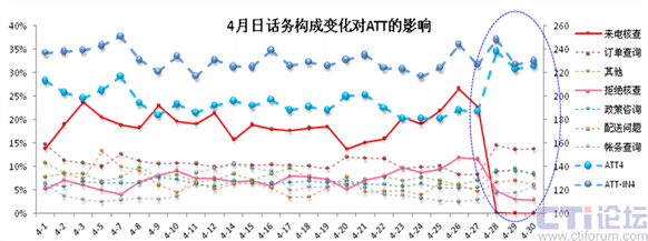 上面是從整月數(shù)據(jù)分析話務構(gòu)成對ATT的影響,下面從日數(shù)據(jù)分析導致4月ATT“月末彈起”現(xiàn)象的原因。(下圖12)
