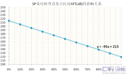 我們把話務構(gòu)成簡單化,假設只有“來電核查”和“Inbound”兩大隊列,在上下6%的波動范圍內(nèi),取ATT(sp)=120秒,ATT(in)=215秒,“SP來電核查”話務占比=x,則“Inbound”話務占比=1-x,ATT(all)=y(tǒng),整體通話均長y與“SP來電核查”話務占比x存在如下線性關系:(下圖13)