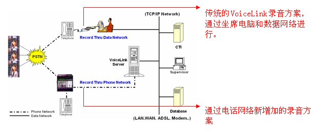 Voicelink 監(jiān)控錄音方案完全適應(yīng)現(xiàn)代呼叫中心的環(huán)境。Voicelink能有效的節(jié)約成本,它不需要專(zhuān)用硬件,能有效的利用包括座席計(jì)算機(jī)和網(wǎng)絡(luò)等公司的現(xiàn)有資源來(lái)進(jìn)行日常電話錄音。但考慮到有些呼叫環(huán)境只有涉及到電話呼入和呼出,也不用跟業(yè)務(wù)應(yīng)用或后臺(tái)數(shù)據(jù)(如證券交易平臺(tái))交互,現(xiàn)在,Voicelink增加了錄音方式來(lái)提高解決方案的能力,該錄音方式是通過(guò)電話網(wǎng)絡(luò)來(lái)錄音的,該新增加的錄音方式完全獨(dú)立于計(jì)算機(jī)和數(shù)據(jù)網(wǎng)絡(luò)。下圖顯示Voicelink提供不同的方式,形成一個(gè)單一的錄音平臺(tái)。