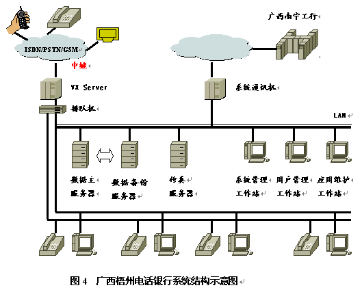 廣西工行推出的第一套銀行呼叫中心系統(tǒng)是在潤(rùn)聲VX綜合信息系統(tǒng)開(kāi)發(fā)平臺(tái)(UNIX版)上,在較短時(shí)間內(nèi)開(kāi)發(fā)成功,首先在梧州分行開(kāi)通運(yùn)行,獲得用戶的一致好評(píng),并希望與潤(rùn)聲公司進(jìn)一步合作。該系統(tǒng)的結(jié)構(gòu)如圖4所示。